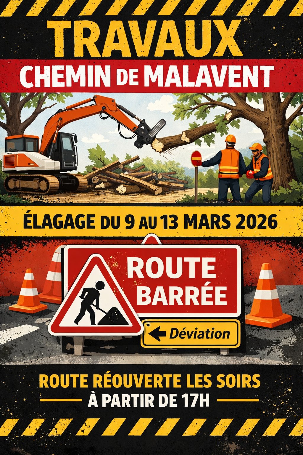 Travaux d’élagage sur le chemin de Malavent du 9 au 13 mars 2026.